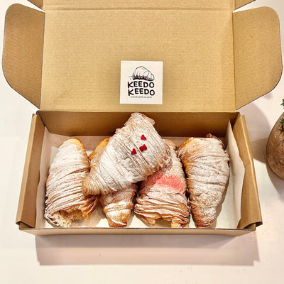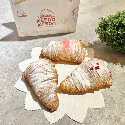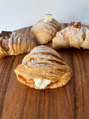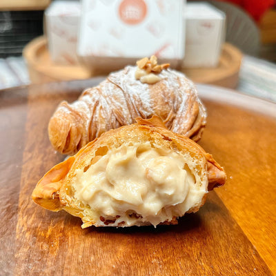 It's a crispy flaky buttery pastry filled with a creamy custard cream, shaped like a lobster tail! Available in 3 flavours!