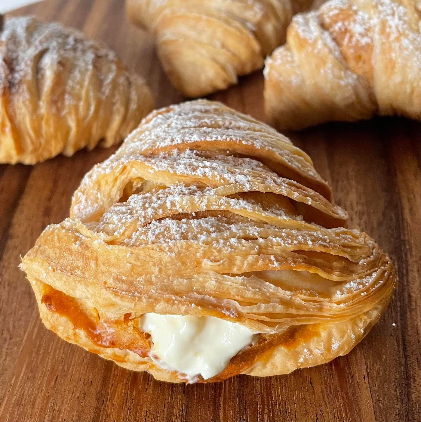 Its original name is called Sfogliatelle, which means ‘thin leaf layers’. The dough is hand stretched until tissue paper thin, rolled and baked into a light flaky crispy pastry.