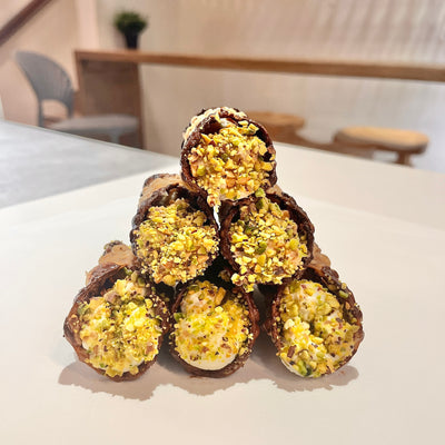 Crisp tube shaped Italian Cannoli filled with smooth Vanilla with maple coated with Pistachio nuts.